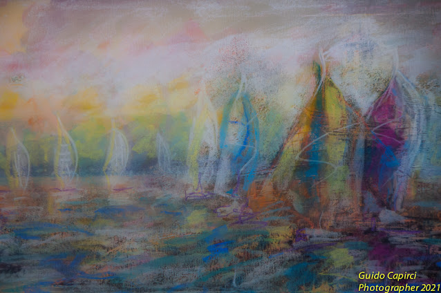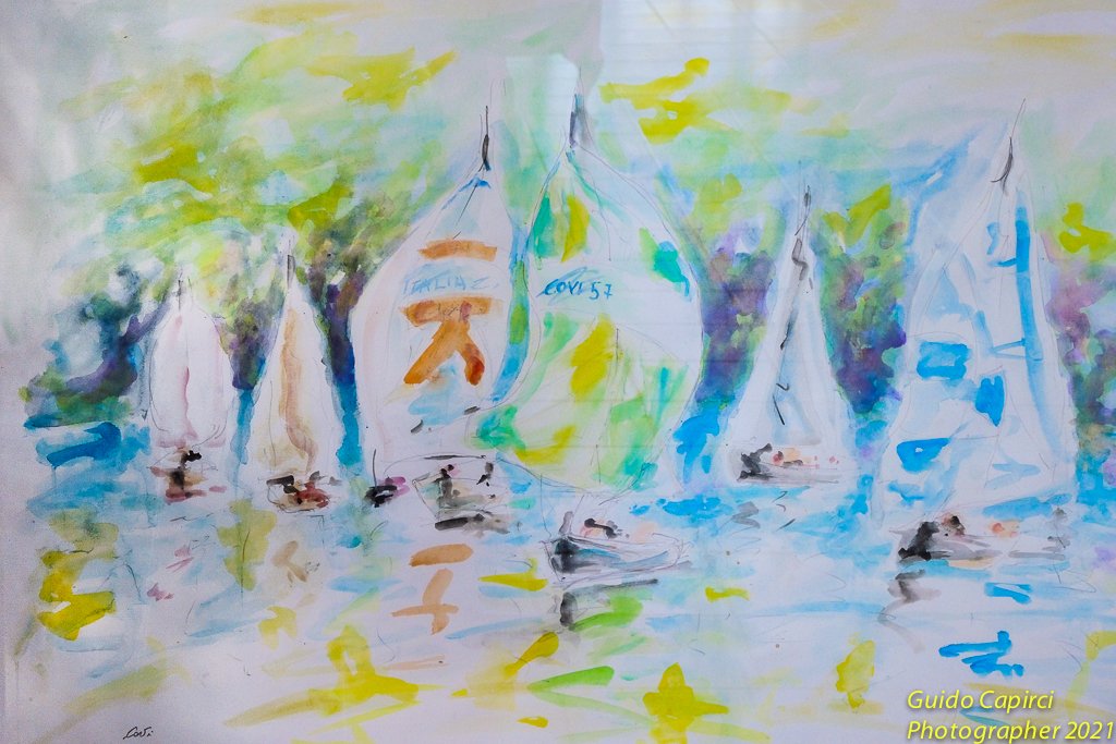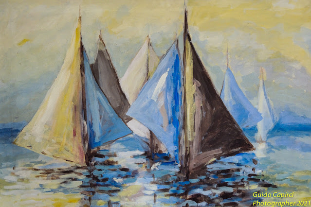 Queste barche con le vele dispiegate, gonfie parlano di regate, di movimento, di estate ma soprattutto di allegria e di libertà.Immagino siano le opere che Cosimo dipinge a mano libera nei momenti in cui , affrancato dal lavoro e dalla routine, si ritrova a dar sfogo alla sua passione che , assieme alla musica, rappresenta la sua fonte di svago e di serenità.E non lesina colori e regala viaggi verso il futuro e la speranza , così importante in questi momenti.
