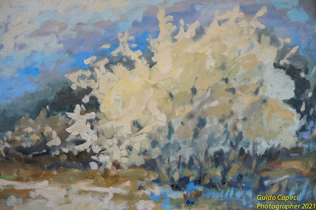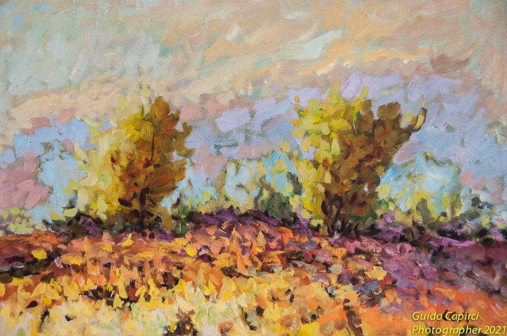 Macchie all’apparenza informi suggeriscono alla mente mandorli in fiore mentre strisciate di messi dorate fanno da quinte a un trionfo di papaveri e fiordalisi in una campagna “maremmana” che si ripete metodicamente, con le sue processioni di salici, pioppi e girasoli che seguono pedissequamente l’andamento del fiume Ombrone.