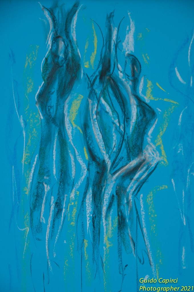 Delizioso anche il dipinto, a sfondo turchese , che mi fa pensare a una danza seducente di nudi femminili…