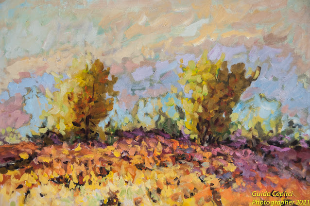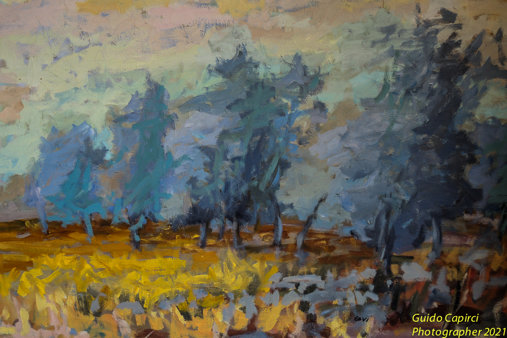 Certo che il colpo d’occhio all’ingresso della Galleria è stato davvero coinvolgente : una vera e propria “full immersion” nella natura in cui l’immagine, pur riconoscibile, appare filtrata dall’uso particolare dei colori che trasfigurano gli elementi formali della realtà come i cieli e la terra.