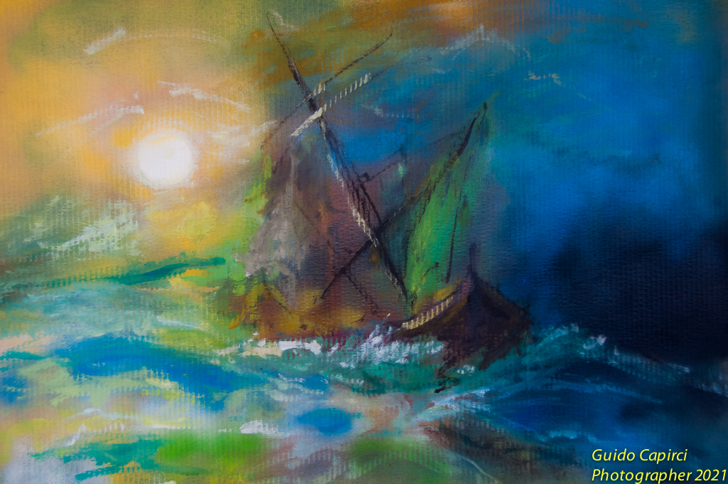 Bello, ma inquietante il contrasto tra luce e oscurità, tra male e bene, tra speranza e condanna che mi ha evocato questo veliero in acque perigliose (barconi della morte?) La luce del sole, divina, sembra indicare la strada sicura lasciando a margine la tempesta e con essa la paura del naufragio.
